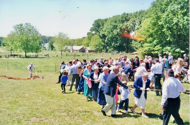 Frank started off by explaining the nuances of plowing with a mule (He’d had plenty of experience with that earlier in life.) Then the rest of us lined up and grabbed onto the rope, which was tied so that three lines of people could participate. As we started to pull, Frank set the plow into the ground and the soil began to roll. It couldn’t have worked any better and was quite a sight to see. The building expansion got off to a glorious start.