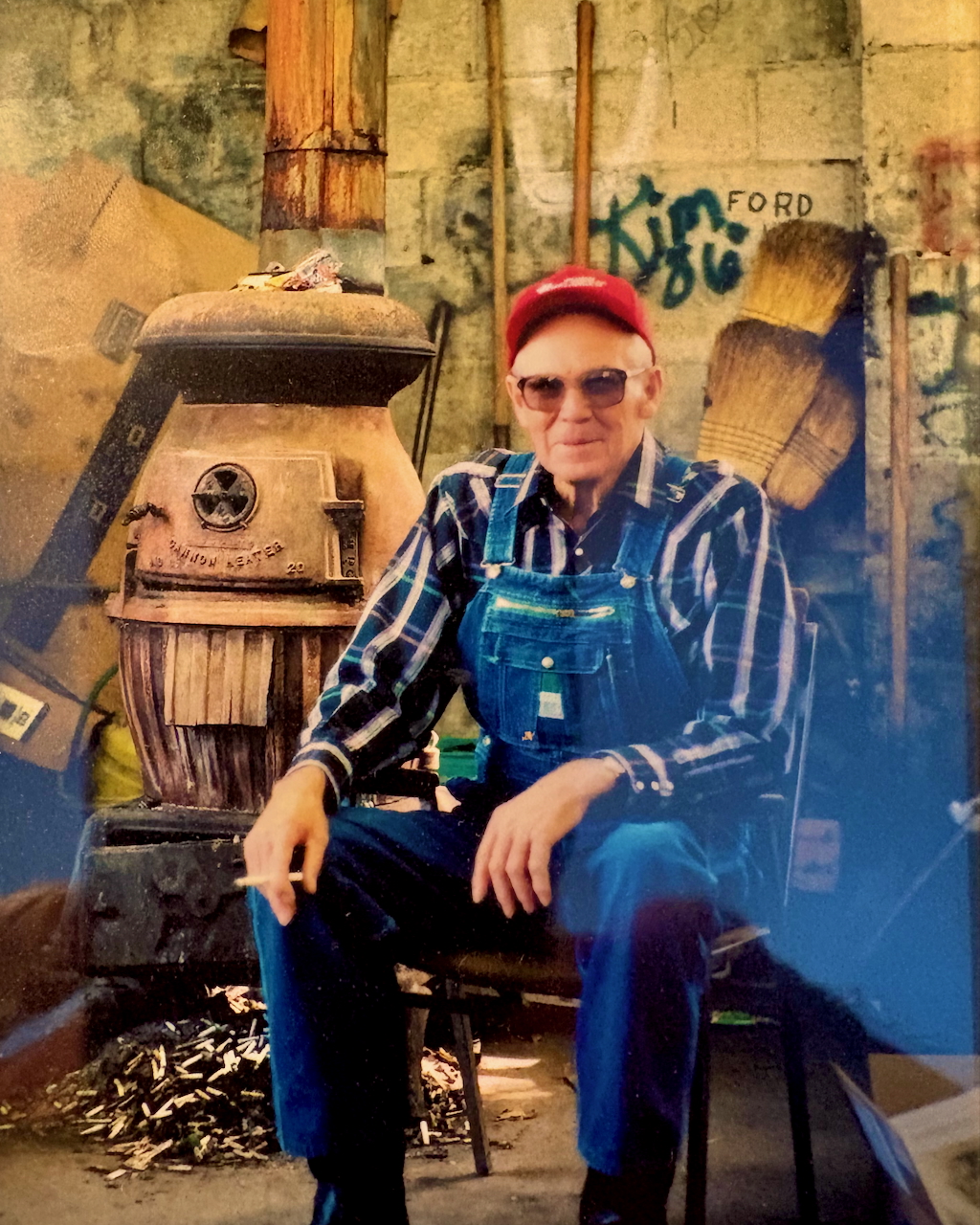 Pictured: The late Bub Carden sitting by his coal potbellied stove in Carden’s Garage.