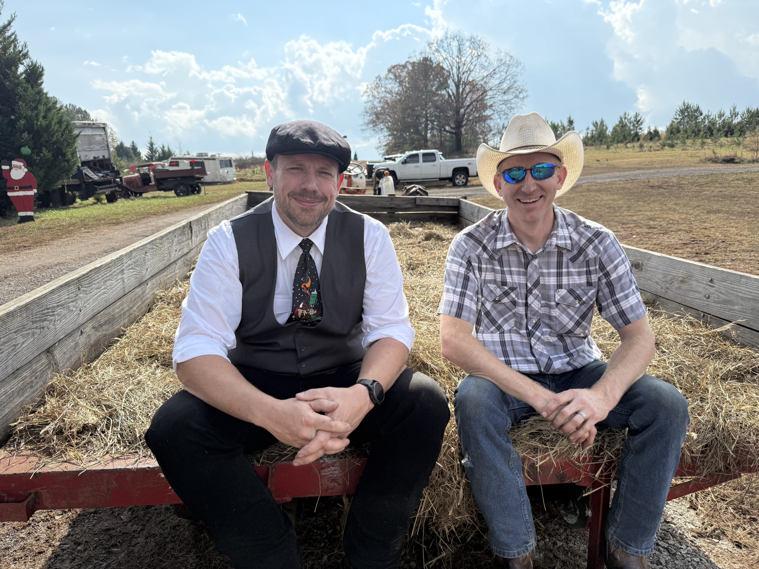 (Pictured: Daniel Perkins (left) and Josh Choitz (right) seated in one of the three wagons making rounds at the tree farm)