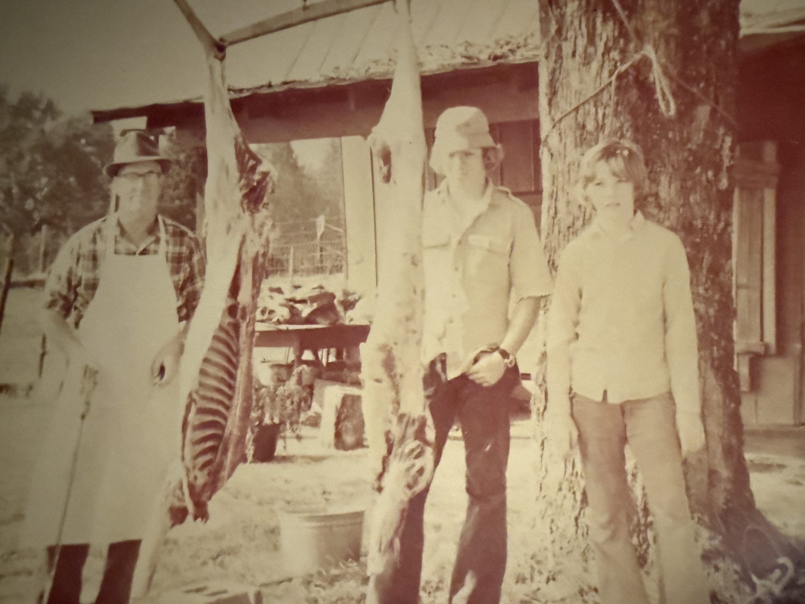 (pictured: Uncle Johnny helped us butcher a deer my brother Rob (right) shot the first time he went deer hunting. It was a big one.  My cool hat was a hand-me-down from Larry Bailey.)